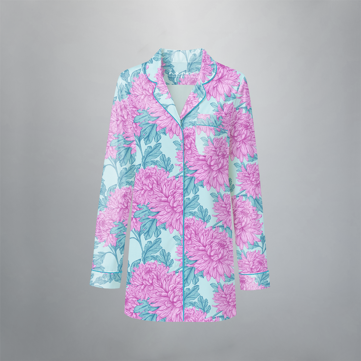 Camisola feminina manga longa na estampa Bouquet Celeste, em tecido 100% algodão com toque acetinado e modelagem solta.
