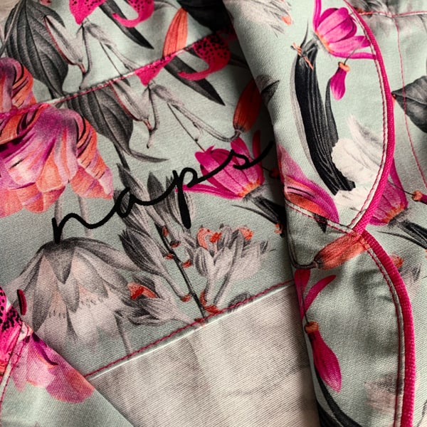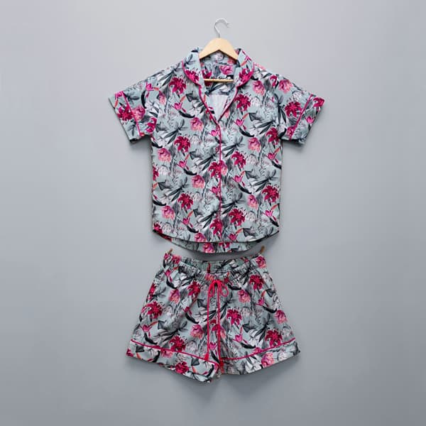 Conjunto pijama de verão feminino na estampa Lilies Iceberg, em tecido 100% algodão com toque acetinado e modelagem solta, composto por camisa manga curta e shorts.