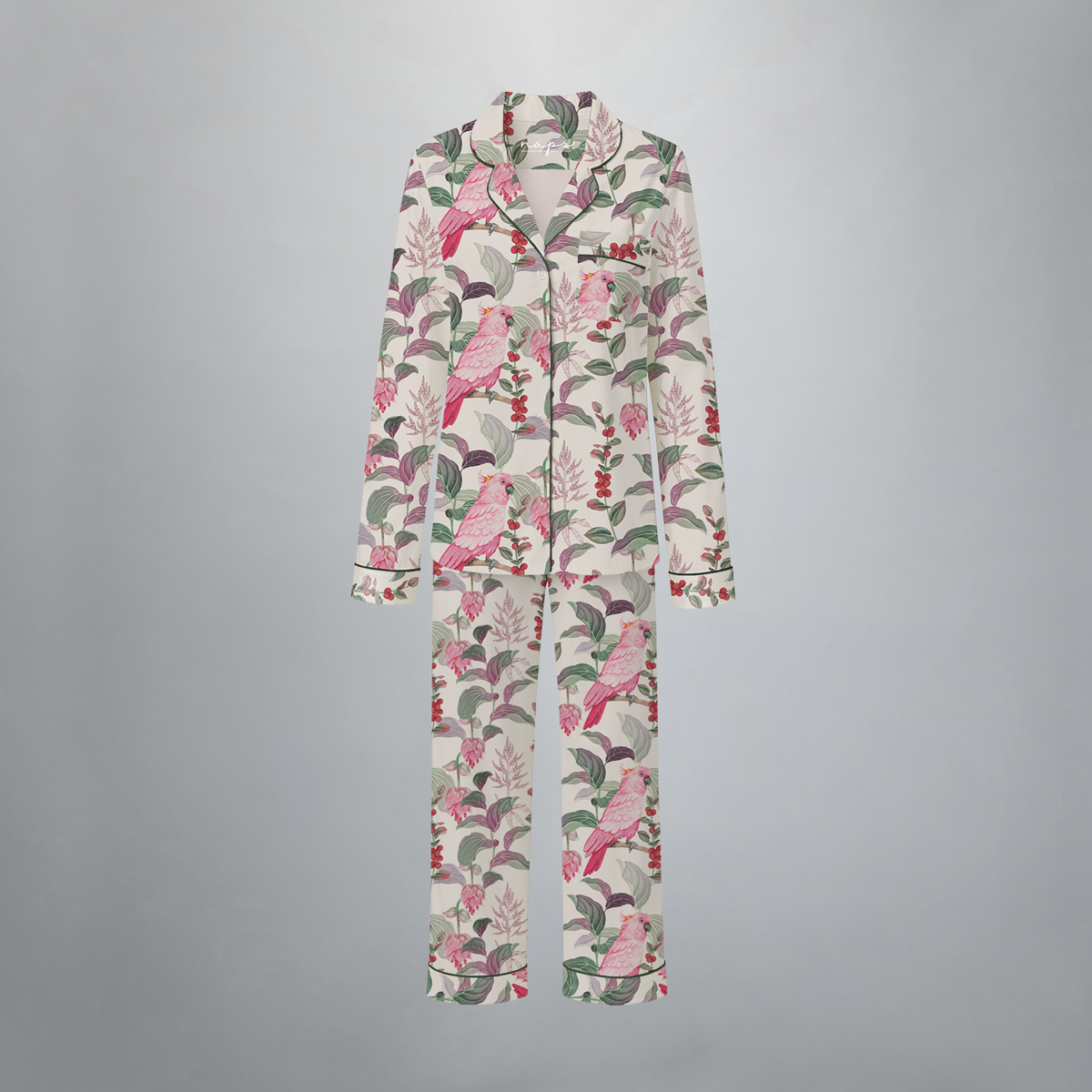 Conjunto pijama personalizado na estampa florida Voo Sereno, feminino, em tecido 100% algodão com toque acetinado e modelagem solta, composto por camisa manga longa e calça.
